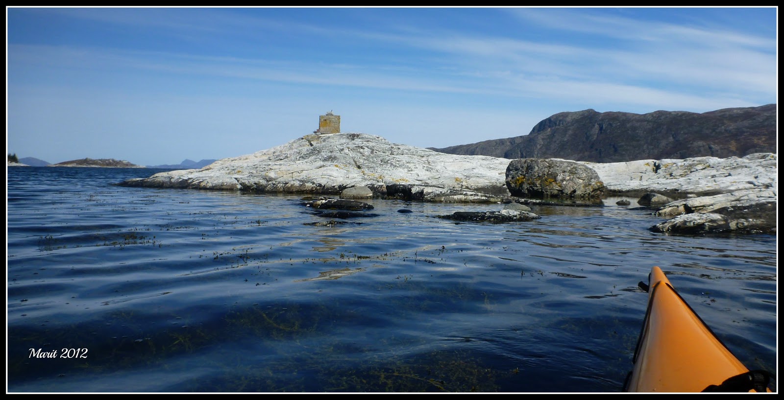 Søndag vakna vi til knallblå himmel :)) Men yr meldte nordavind så då blei det berre ein liten padletur på Høyvikja og ut til Raudøyna.Skal snart på kurs så då kan det no hende vi blir litt tøffare om da skulle kruse seg litt;) men mykje fint å sjå på her inne og,å deilig med sol som heta i kjakane :))